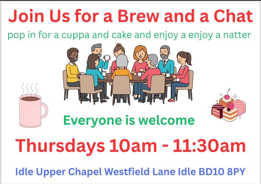 The church is open from 10am – 11.30am on Thursdays for tea/coffee and cake so why not join us for a cuppa and drop off a donation.